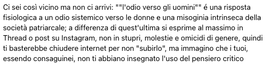 La misandria avrà pure un bersaglio, ma non ha delle vittime di cui quasi tutti i giorni si possa aggiornare il conteggio efferato. Non uccidiamo e non feriamo nessuno, non impediamo a nessun uomo di avere il mestiere o le passioni che preferisce, di vestirsi come vuole, di camminare per la strada a notte fonda, o di esprimersi come gli pare. E anche quando qualcuno si arroga il diritto di imporre queste cose a un gruppo di uomini, è anche lui un uomo e lo fa sempre nel quadro dell’etero-patriarcato.― Pauline Harmange, Odio gli uomini, Garzanti 2020