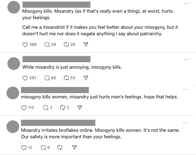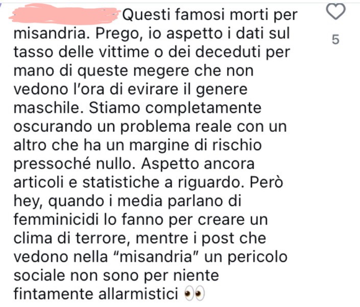 L’accusa di misandria è un meccanismo di silenziamento: un modo di mettere a tacere la rabbia, a volte violenta ma sempre legittima, delle persone oppresse contro i loro oppressori. Scandalizzarsi di fronte alla misandria, trattarla solo come un’altra forma di sessismo e altrettanto condannabile (come se il sessismo venisse condannato…), significa nascondere maliziosamente sotto il tappeto i meccanismi che fanno dell’oppressione sessista un fenomeno sistemico, sostenuto dalla storia, dalla cultura e dalle autorità. Significa affermare che una donna che odia gli uomini è altrettanto pericolosa di un uomo che odia le donne – e che non ha alcuna ragione di provare certi sentimenti, che siano di ostilità, diffidenza o disprezzo. Ma infatti, quando mai nella storia dell’umanità un uomo ha fatto del male a una donna? O più in generale, quando mai gli uomini hanno fatto del male alle donne?