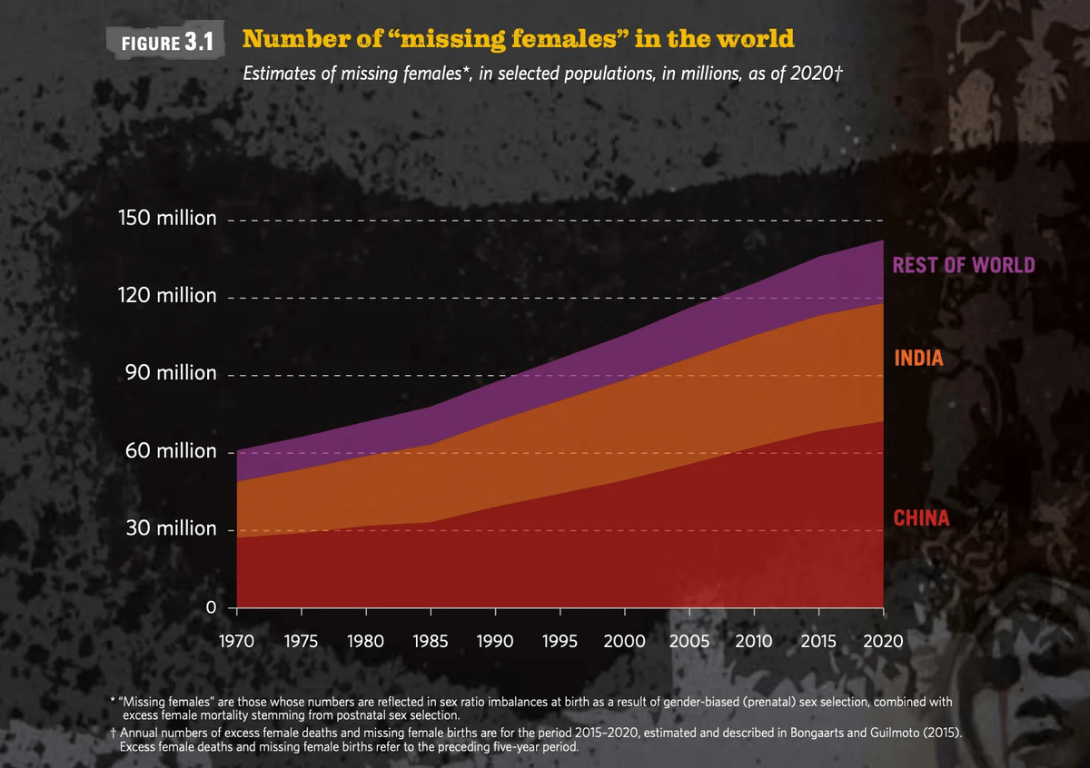 - “Missing girls”: secondo le stime UNFPA, oltre 140 milioni di donne e bambine “mancano” dalle statistiche demografiche mondiali — mai nate a causa di aborto selettivo o morte precocemente per negligenza e discriminazione. Solo nel 2020, si stima che circa 1,2 milioni di nascite femminili siano state “perse” a causa della selezione prenatale del sesso.