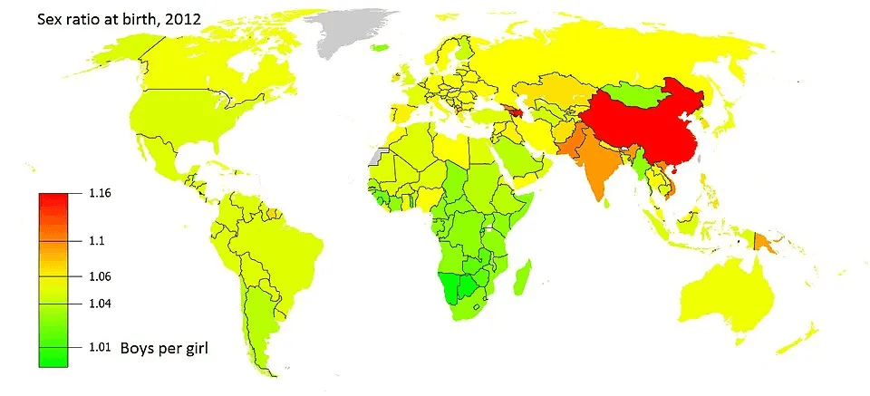 Mappa mondiale dei rapporti di natalità per sesso (sex ratio), 2012. Fonte: Wikipedia