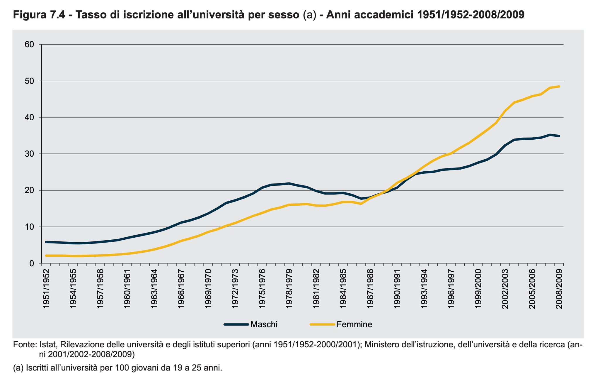 Invece dal 1875, in cui le università italiane sono ufficialmente aperte alle donne, e soprattutto a partire dal 1990 — anno in cui per la prima volta il numero di immatricolati è stato paritario tra studenti e studentesse — le donne hanno progressivamente superato gli uomini in termini di successo scolastico e titoli di studio ottenuti [ISTAT 2011].