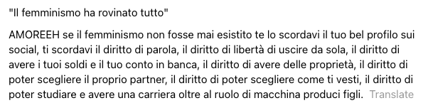 Non viene lasciato spazio per distinguere tra riconoscere il valore storico di certe conquiste e criticare le derive che il movimento ha preso nel tempo. La possibilità stessa di dissentire viene trattata come un privilegio elargito dal femminismo, non come un diritto naturale di ogni essere umano in una società libera. Così, chiunque osi mettere in discussione alcuni approcci femministi moderni si trova subito delegittimata, come se perdesse il diritto stesso di partecipare alla discussione.