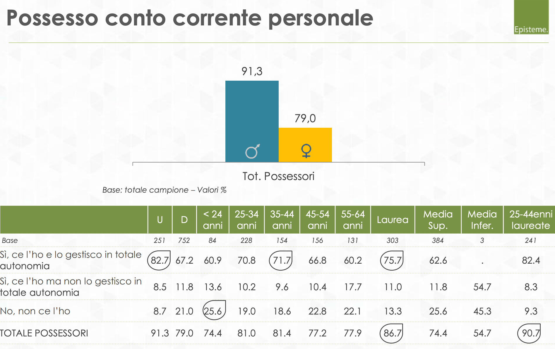 Realisticamente i due gruppi si sovrappongono almeno in parte, quindi potremmo ipotizzare un 10% di donne effettivamente senza conto. Il range teorico tuttavia va da 0% (se tutte le donne senza conto personale ne hanno uno familiare) a 21% (se nessuna di loro ce l’ha), quindi senza un dato preciso non possiamo stabilirlo dal solo report della ricerca.